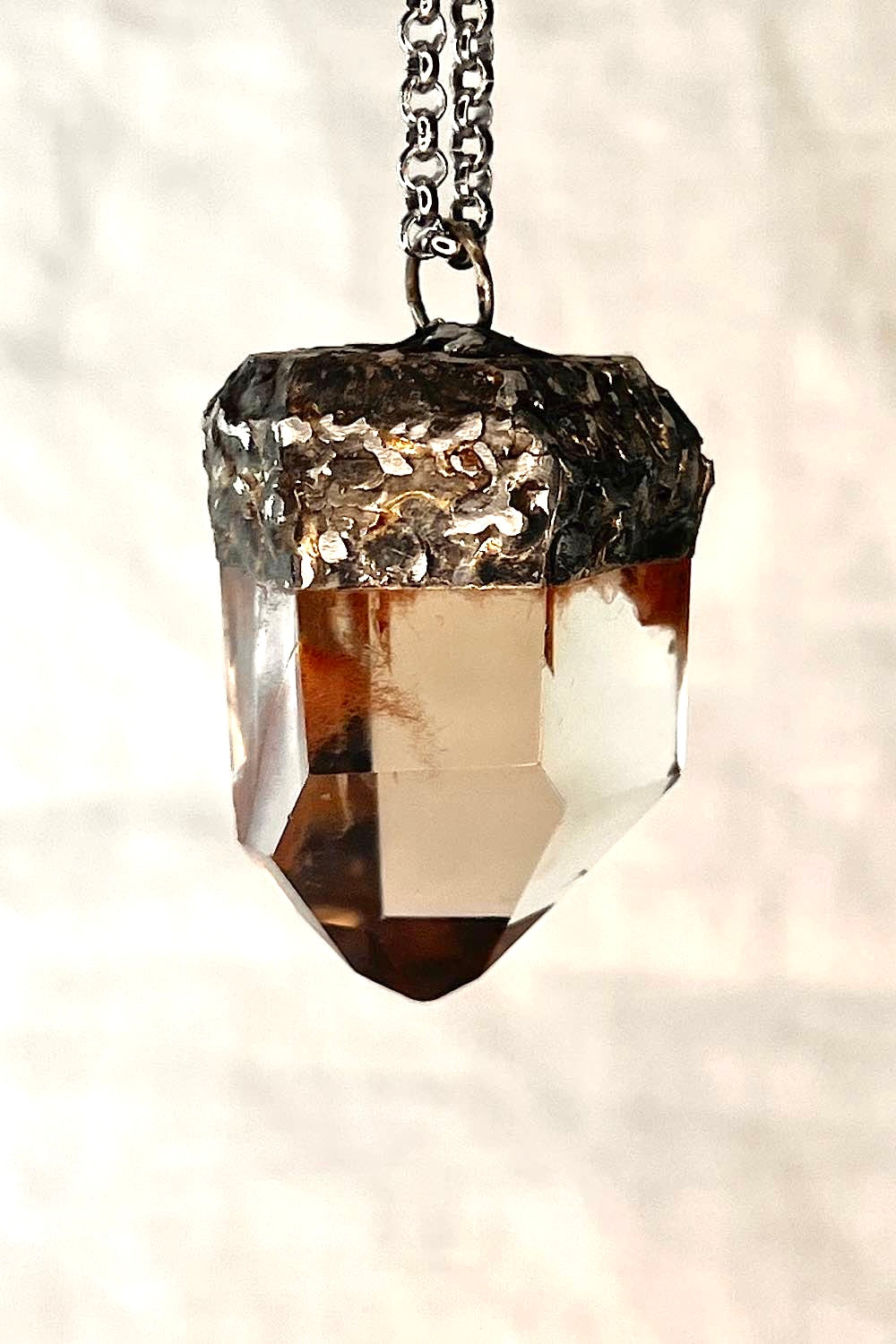 This stunning pendant is created using a natural Amphibole Quartz crystal, known for its striking inclusions. With warm tones of caramel, rust, and smoky cream flowing through its clear body, each angle reveals unique patterns that resemble wisps of clouds or brushstrokes in stone.