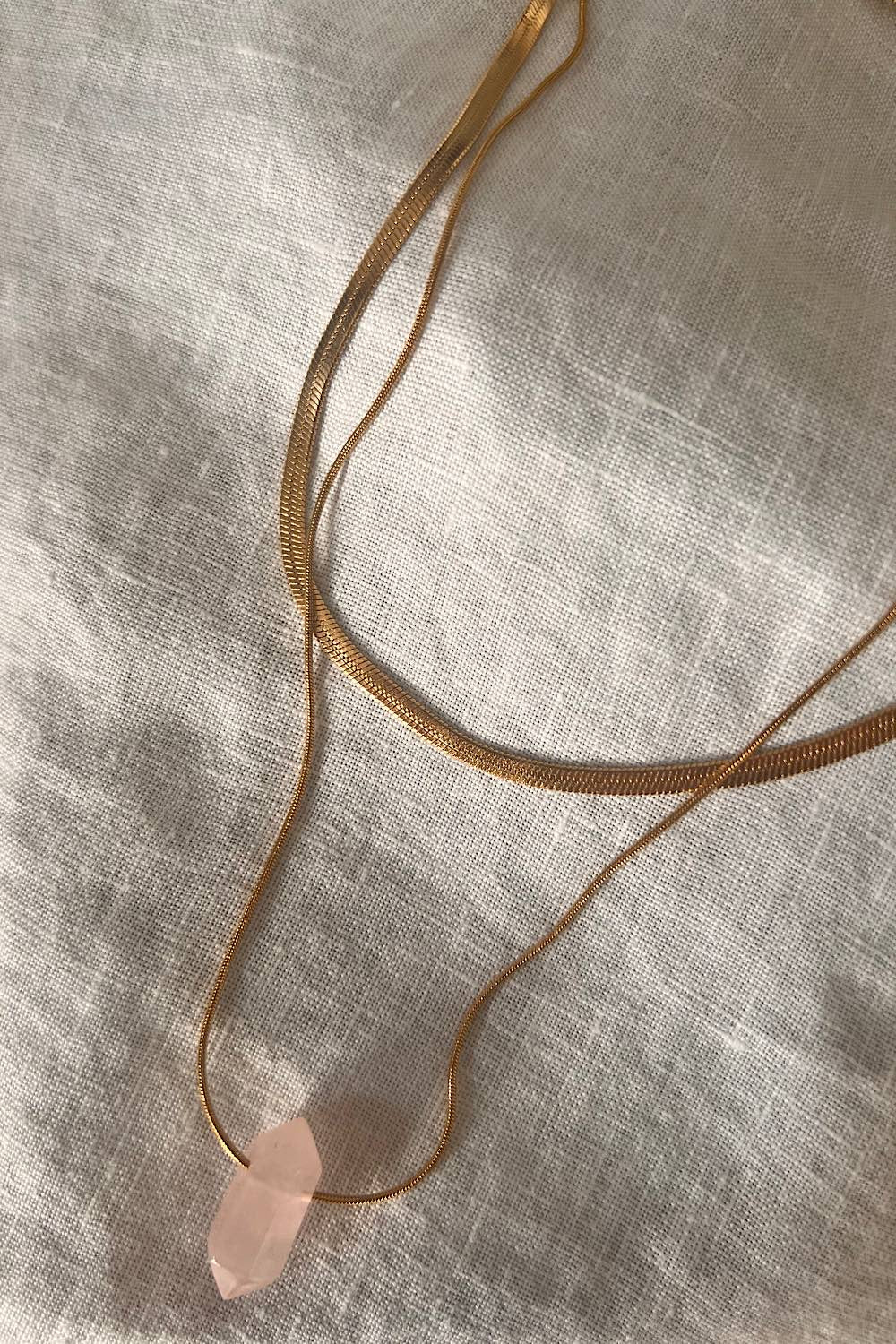 Tarnish proof gold tone flat snake chain & round snake chain with double terminated rose quartz.